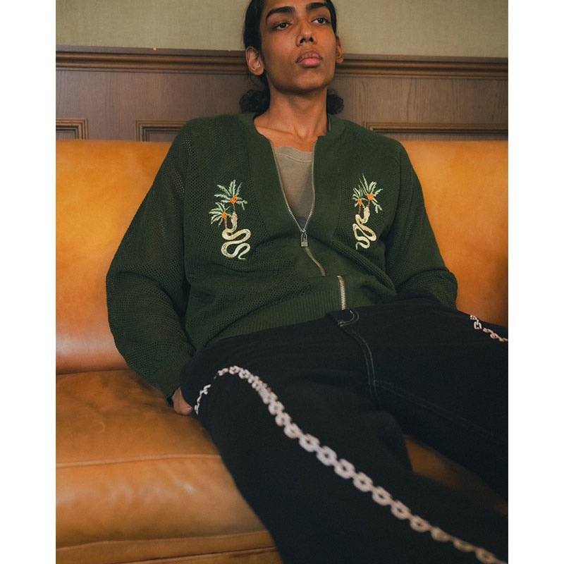 25SSテーマ、ウロボロスに因んだ蛇の刺繍を夏らしくリゾート柄と組み合わせています。