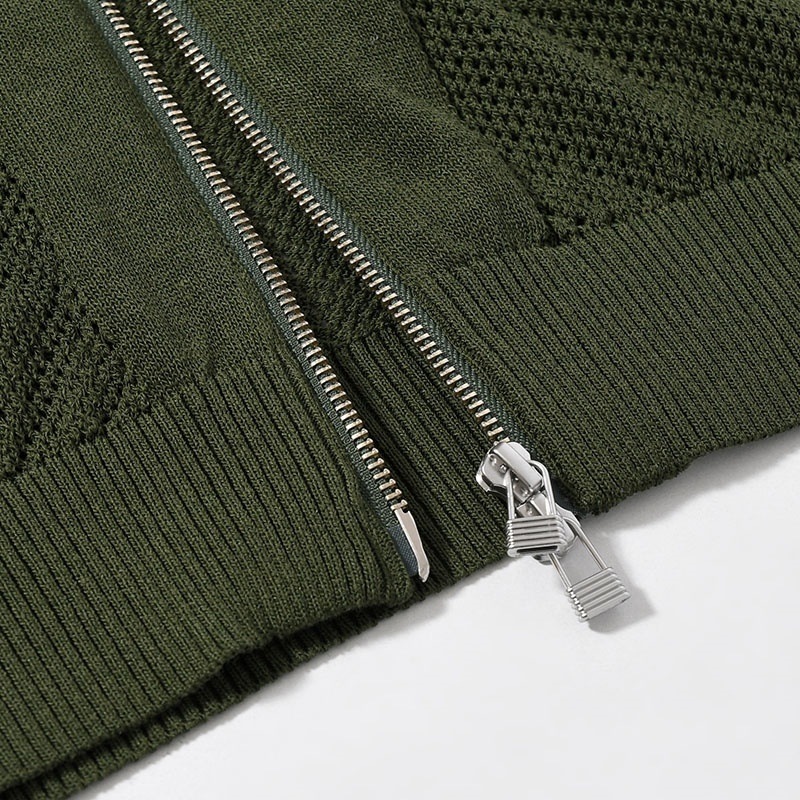 ポリエステル混のシャリ感のある糸を使用した薄手のニットブルゾン。