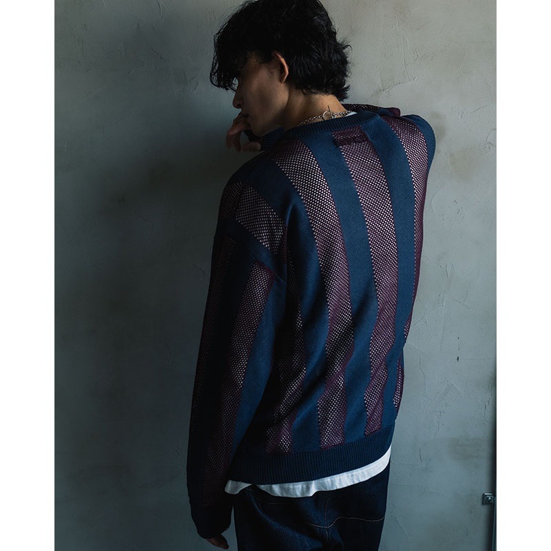 サッカーユニフォームを思わせるストライプ柄を、メッシュ編みと天竺編みを組み合わせて表現。