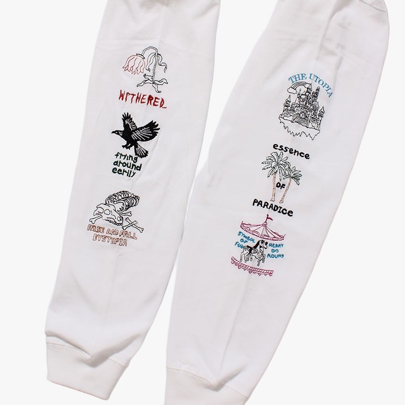 両袖には「楽園」と「失楽園」を緩やかなステッチ刺繍で表現、胸元にはシーズンテーマのワンポイント刺繍が施されています。