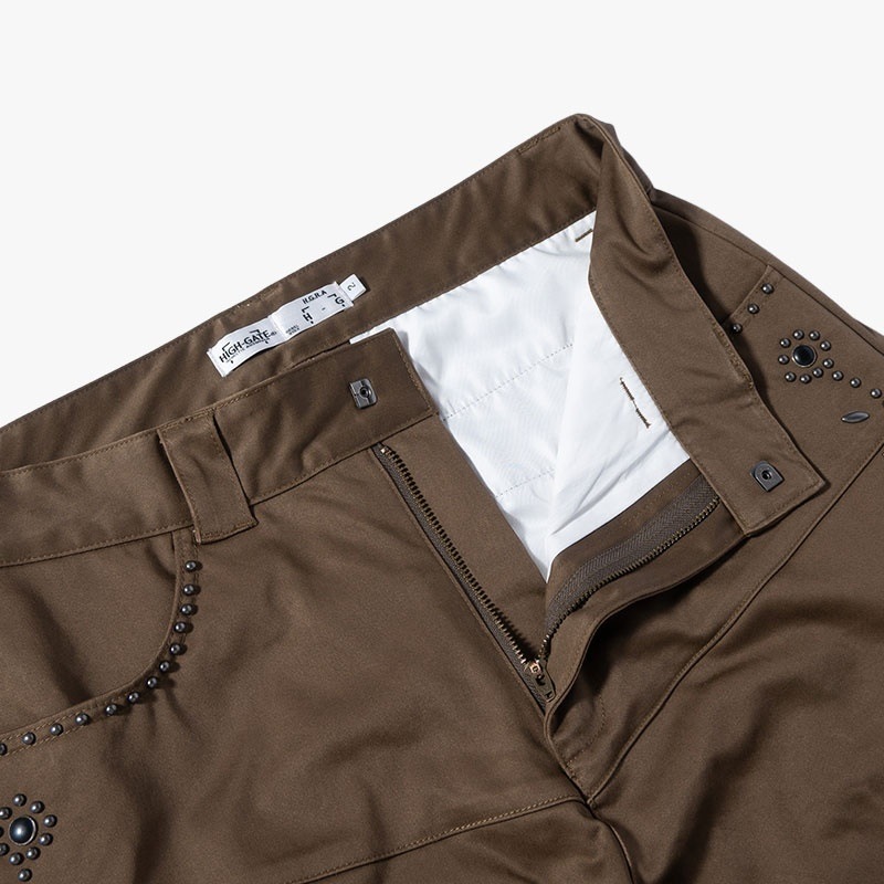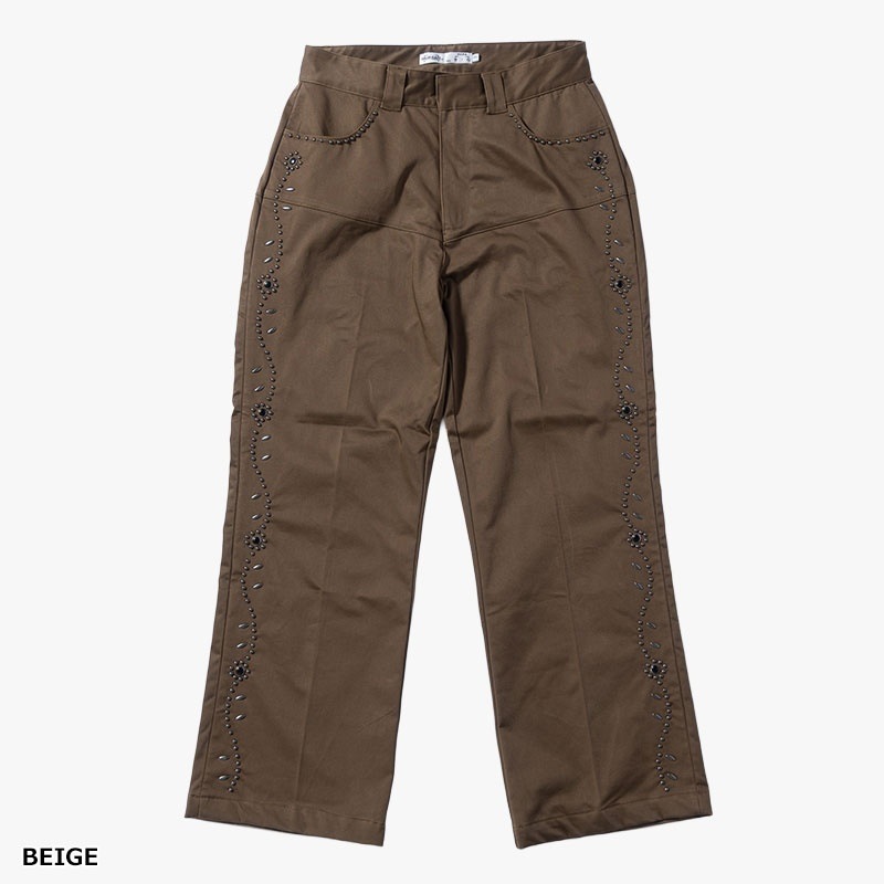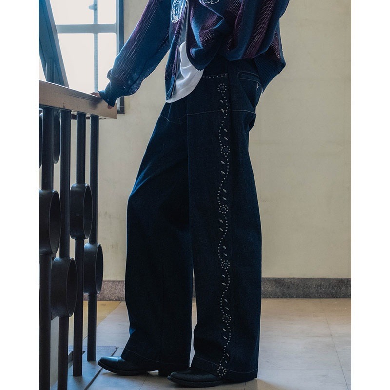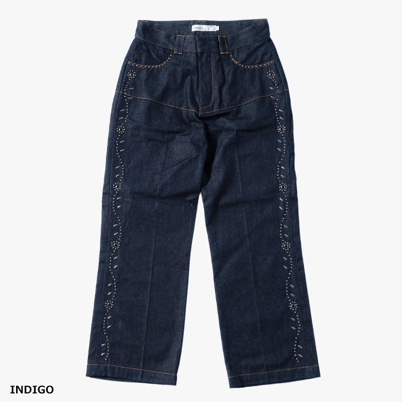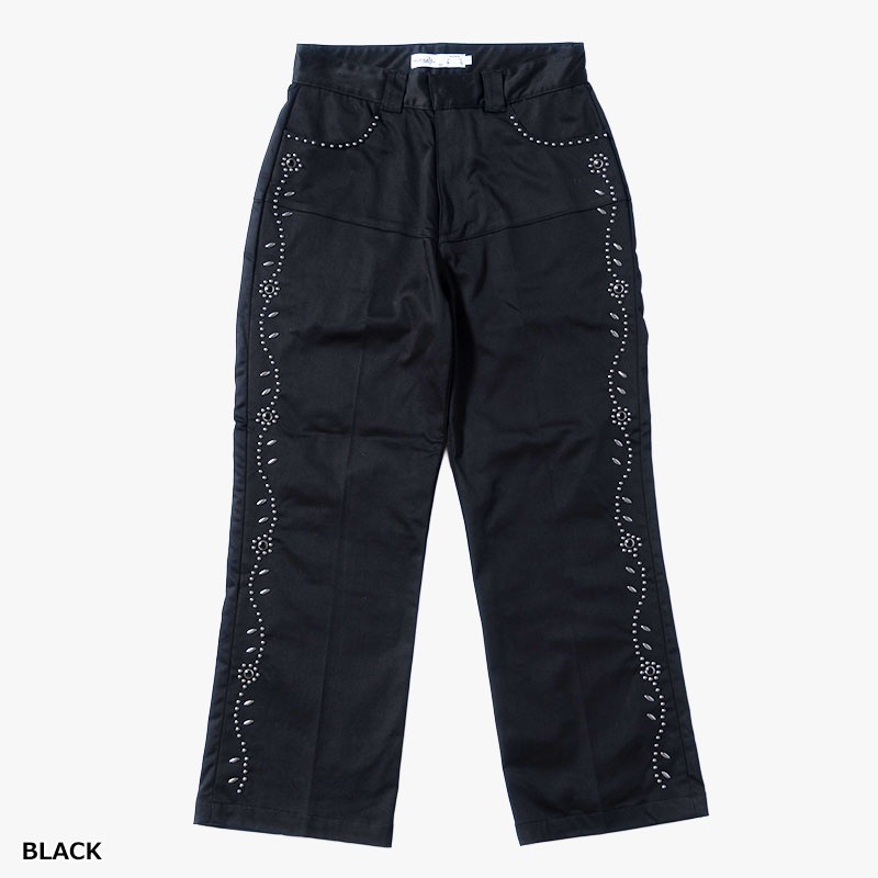 両サイドにフラワーモチーフのスタッズを配したデザインパンツ。