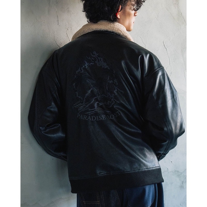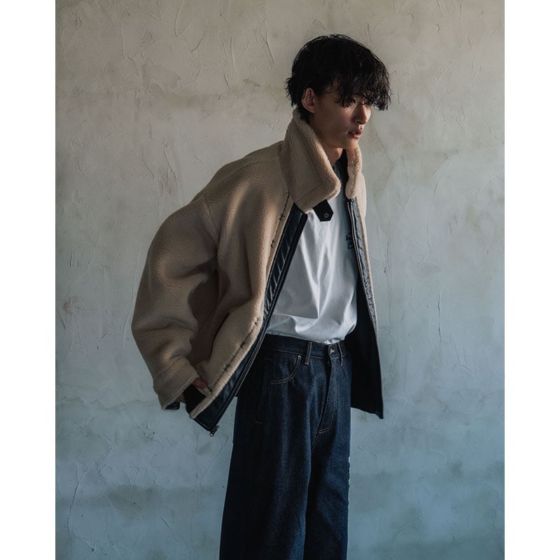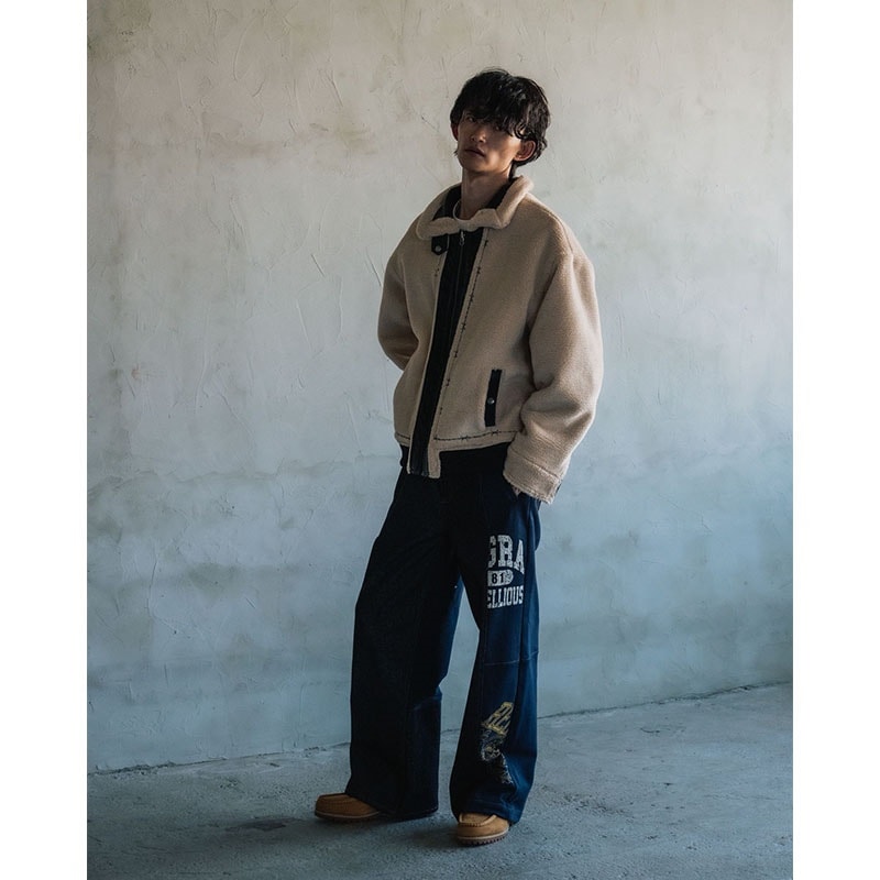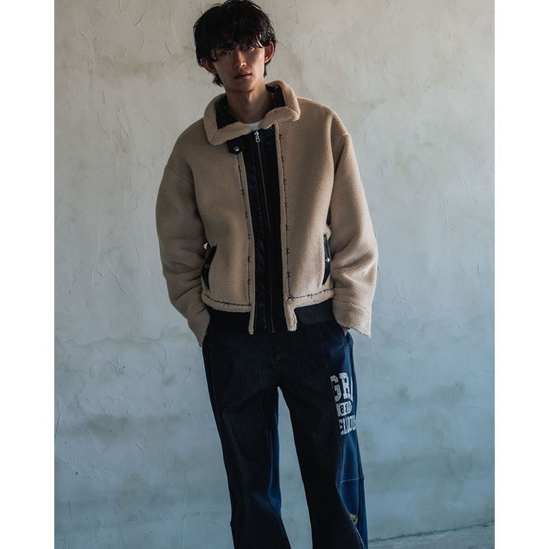 裏面はボアの柔らかな表情を活かしながら、部分的に表地を配し、有刺鉄線の刺繍でコントラストを形成。甘さを抑え、リバーシブルでありながら両サイドが主役になるデザインへと仕上げています。