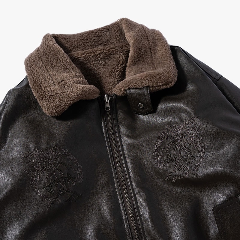 レザー面はムートンジャケットを連想させるディテールと同系色の刺繍を組み合わせ、重厚さの中にソリッドなムードを残しています。刺繍はヴィンテージスーベニアに散見されるアロハモチーフをベースに、ブランドのフィルターを通して再構築しました。