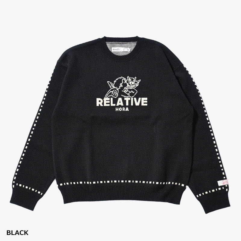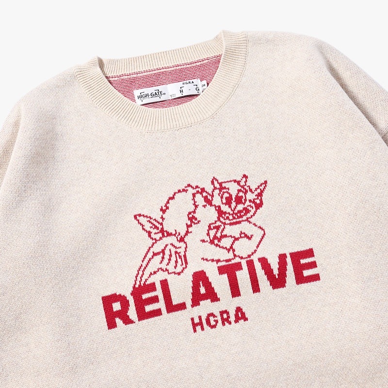 フロントには、天使と悪魔、善と悪という相反するモチーフをジャガード編みで表現。